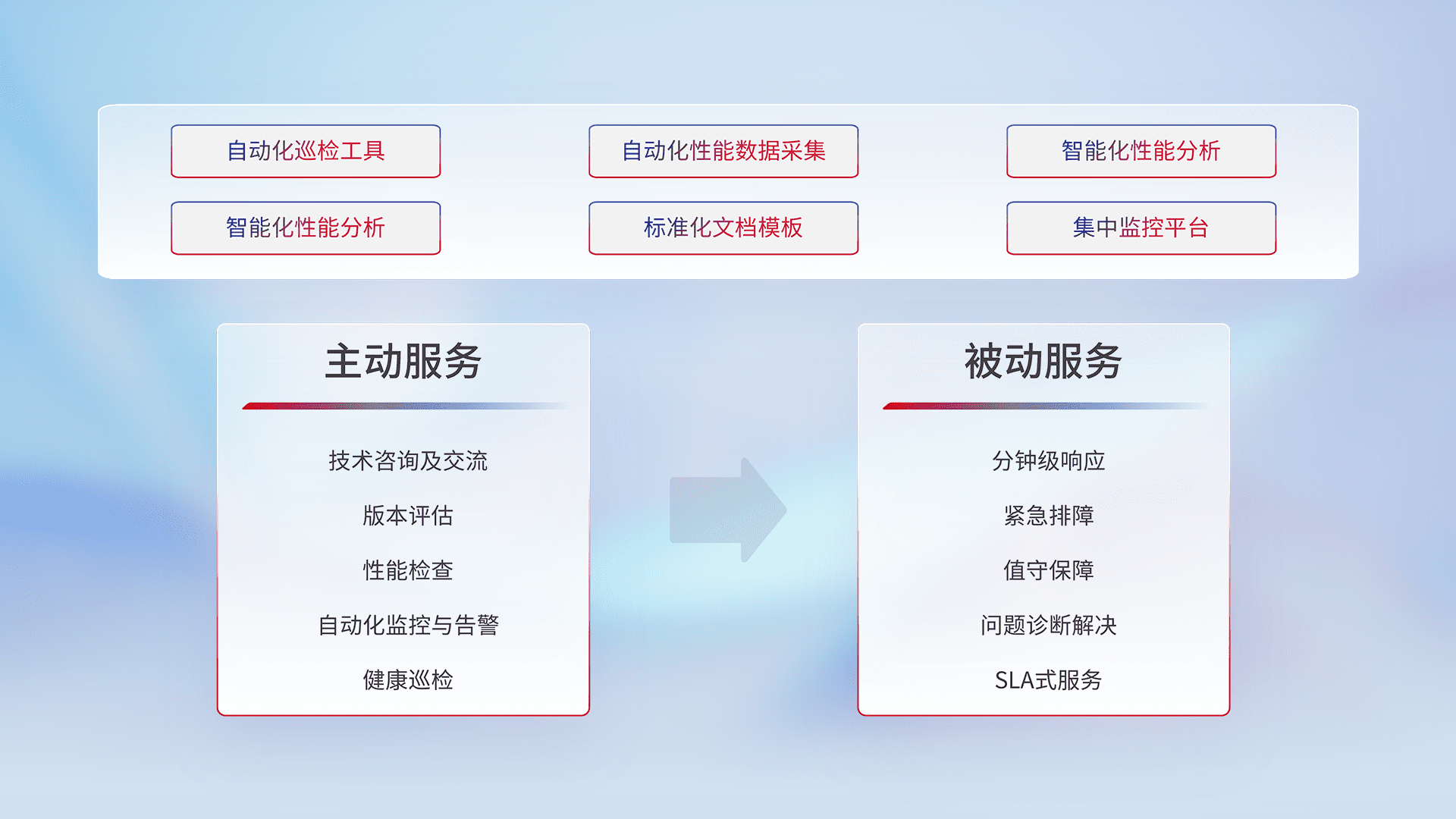 智能化工具和标准化文档,,保障服务质量,,,,提供主动服务(包含技术咨询、、、、版本评估、、、、性能检查、、自动化监控与告警、、、、健康巡检)和被动服务包含(分钟级响应、、、紧急排障、、值守保障、、、、问题诊断解决、、、SLA服务)。。。